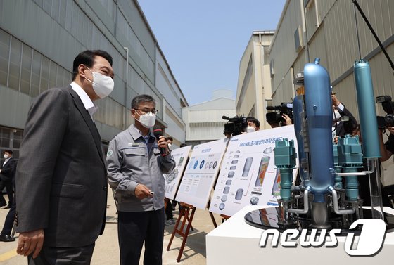 윤석열 대통령이 22일 경남 창원 성산구 두산에너빌리티 원자력 공장을 방문해 김종두 전무의 설명을 들으며 한국형 원자로 APR1400 축소 모형을 살펴보고 있다. (대통령실 제공) 2022.6.22/뉴스1 © News1 안은나 기자