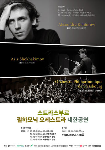 스트라스부르 필하모닉 오케스트라는 이번 공연에서 크리스마스라는 계절적 특성을 감안해 입체적 색감과 리듬감이 돋보이는 비제의 ‘카르멘 모음곡 1번’을 비롯해 차이콥스키 피아노 협주곡 2번, 라벨이 편곡한 무소륵스키의 ‘전람회의 그림’을 들려줄 예정이다.