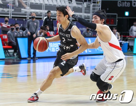 18일 오후 경기 수원KT소닉붐아레나에서 열린 ‘2021-22 KGC인삼공사 정관장 프로농구’ 수원 KT 소닉붐과 울산 현대모비스 피버스의 경기에서 KT 허훈이 드리블 하고 있다. 2022.3.18/뉴스1 © News1 안은나 기자