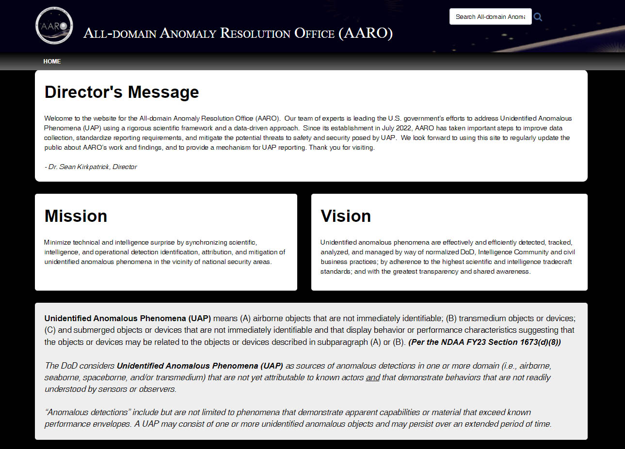 국방부는 “국민들에게 AARO의 업무를 투명하게 공개하고자 최선을 다하고 있다”며 “이 웹사이트는 AARO 및 UAP와 관련해 모든 공개 정보를 제공하는 원스톱 상점 역할을 하게 된다”고 설명했다. AARO가 UAP에 대한 새로운 정보를 수집하면 국방부가 이를 웹사이트에 정기적으로 게재하는 방식이다.