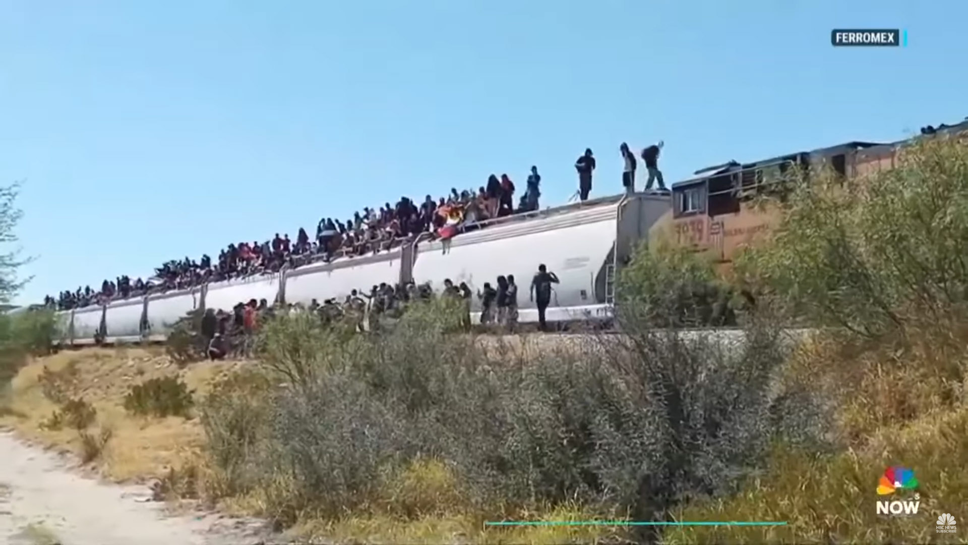 멕시코에서 중남미 이민자들이 미국으로 가기 위해 국경지대로 향하는 화물열차의 지붕에 올라타고 있다. 사진=NBC 뉴스 유튜브 스크린샷.