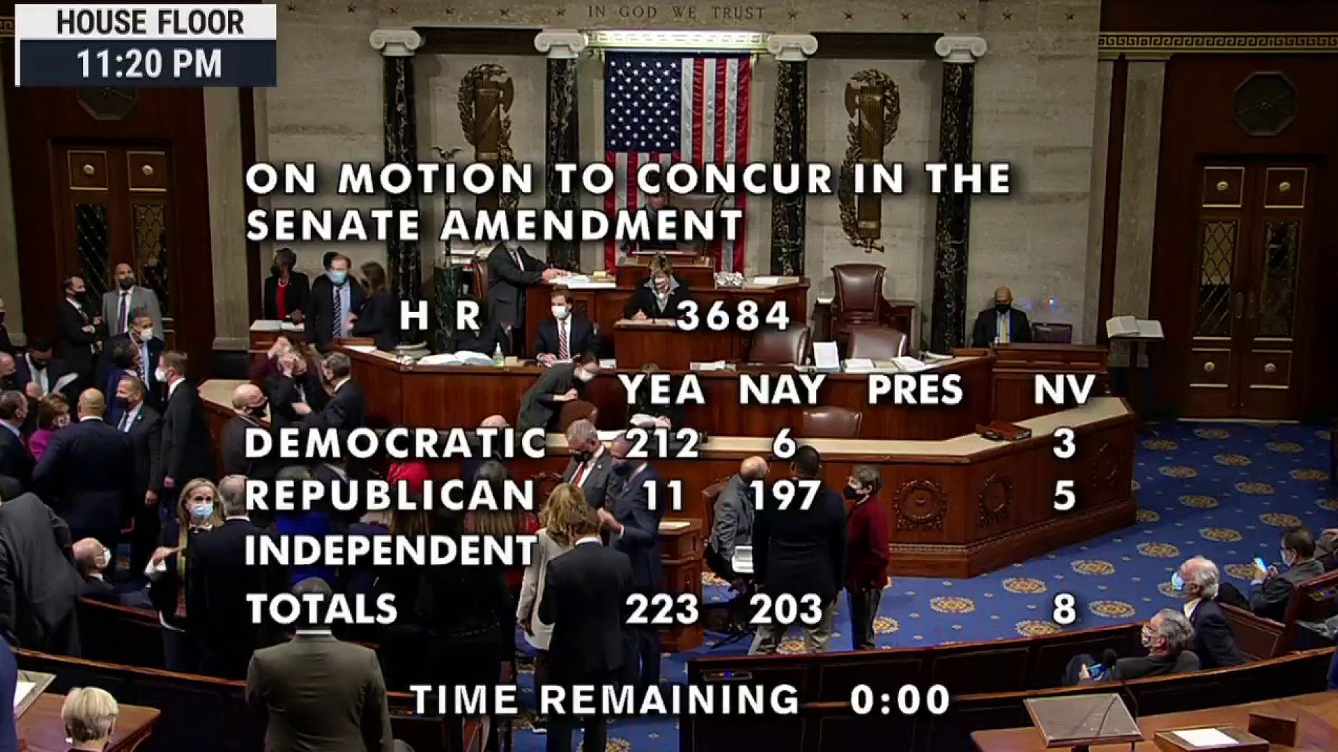공화당 하원의원 13명은 민주당에 합류해 1조2천억 달러 규모의 인프라 투자 및 일자리 법안에 찬성표를 던졌다. 반면, 6명의 진보적인 민주당 의원들은 3조5천억 달러로 제시됐다가 1조7500억 달러로 축고된 사회복지 지출법안에 대한 표결이 없다면 인프라 법안 통과에 찬성할 수 없다면서 반대표를 던졌다.