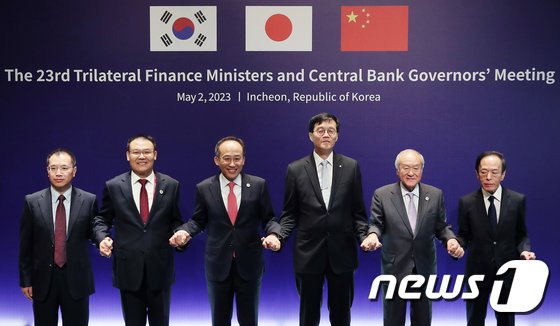 추경호 경제부총리와 이창용 한국은행 총재를 비롯한 한중일 재무장관 및 중앙은행 총재들이 2일 오전 인천 송도 오크우드 프리미어 호텔에서 열린 '한중일 재무장관·중앙은행 총재 회의' 시작에 앞서 포토세션을 갖고 있다. 왼쪽부터 천칭 인민은행 국제심의관, 왕동웨이 중국 재정부부장, 추경호 부총리, 이창용 총재, 스즈키 슌이치 일본 재무장관, 우에다 가즈오 일본은행 총재. 2023.5.2/뉴스1 © News1 민경석 기자