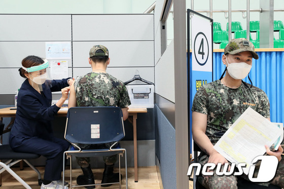 지난 7일 경기도 성남 소재 국군수도병원 코로나19 백신 접종센터에서 30세 미만 장병들이 미국 화이자 개발 백신을 맞고 있다. (국방일보 제공) 2021.6.7/뉴스1
