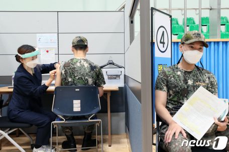 지난 7일 경기도 성남 소재 국군수도병원 코로나19 백신 접종센터에서 30세 미만 장병들이 미국 화이자 개발 백신을 맞고 있다. (국방일보 제공) 2021.6.7/뉴스1