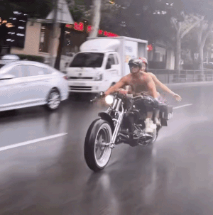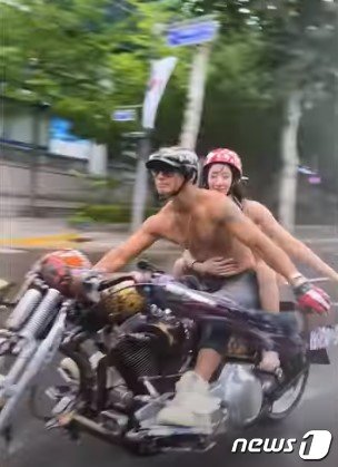 지난달 31일 비 오는 강남 한복판 도로에서 상의를 탈의한 남성과 비키니 차림의 여성이 오토바이를 타고 질주하는 모습이 포착돼 논란이다.