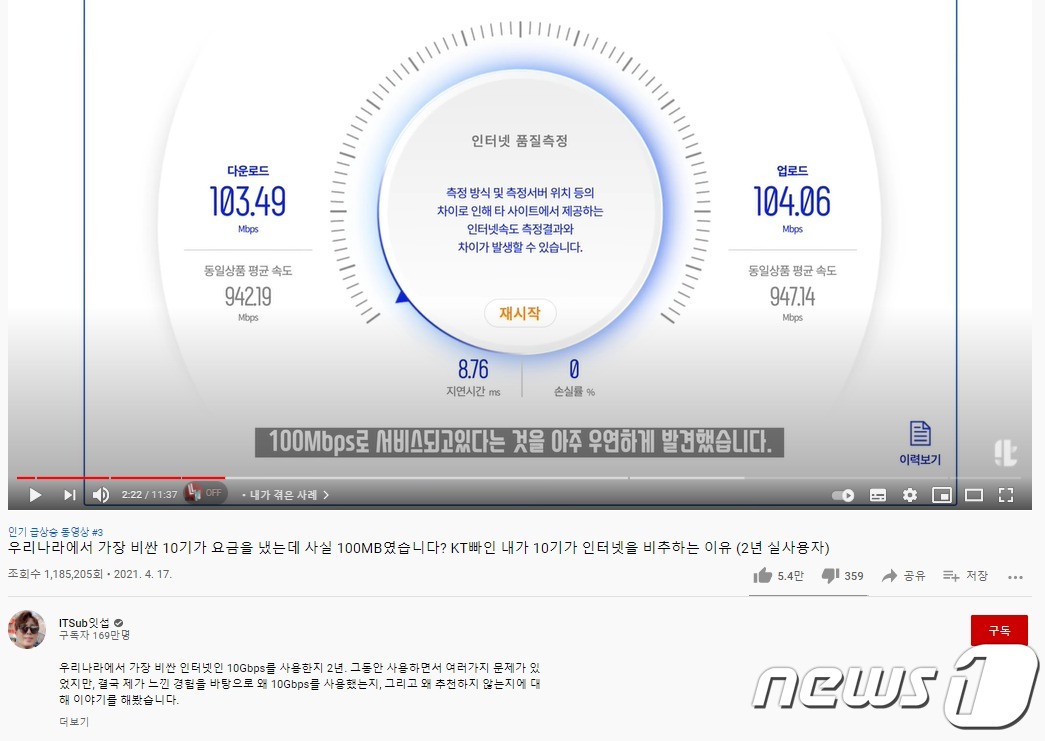 잇섭은 영상에서 “스튜디오를 옮기면서 월 8만8000원의 10Gbps 인터넷을 설치했다. 그러나 스튜디오 인터넷이 100Mbps로 서비스되고 있다는 사실을 우연히 알게 됐다”며 “고객센터에 전화한 후에 제대로 된 속도가 나왔다”고 말했다.