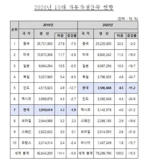 이 가운데 1~4위의 순위 변동은 없었으나 중국 2%, 미국 19%, 일본 16.7%, 독일 24.7% 각각 생산량이 줄었다. 5위를 차지한 한국의 경우 생산량이 11.2% 감소했으나 상대적으로 감소폭이 적어 2019년 7위에서 2020년 5위로 2계단 점프했다.