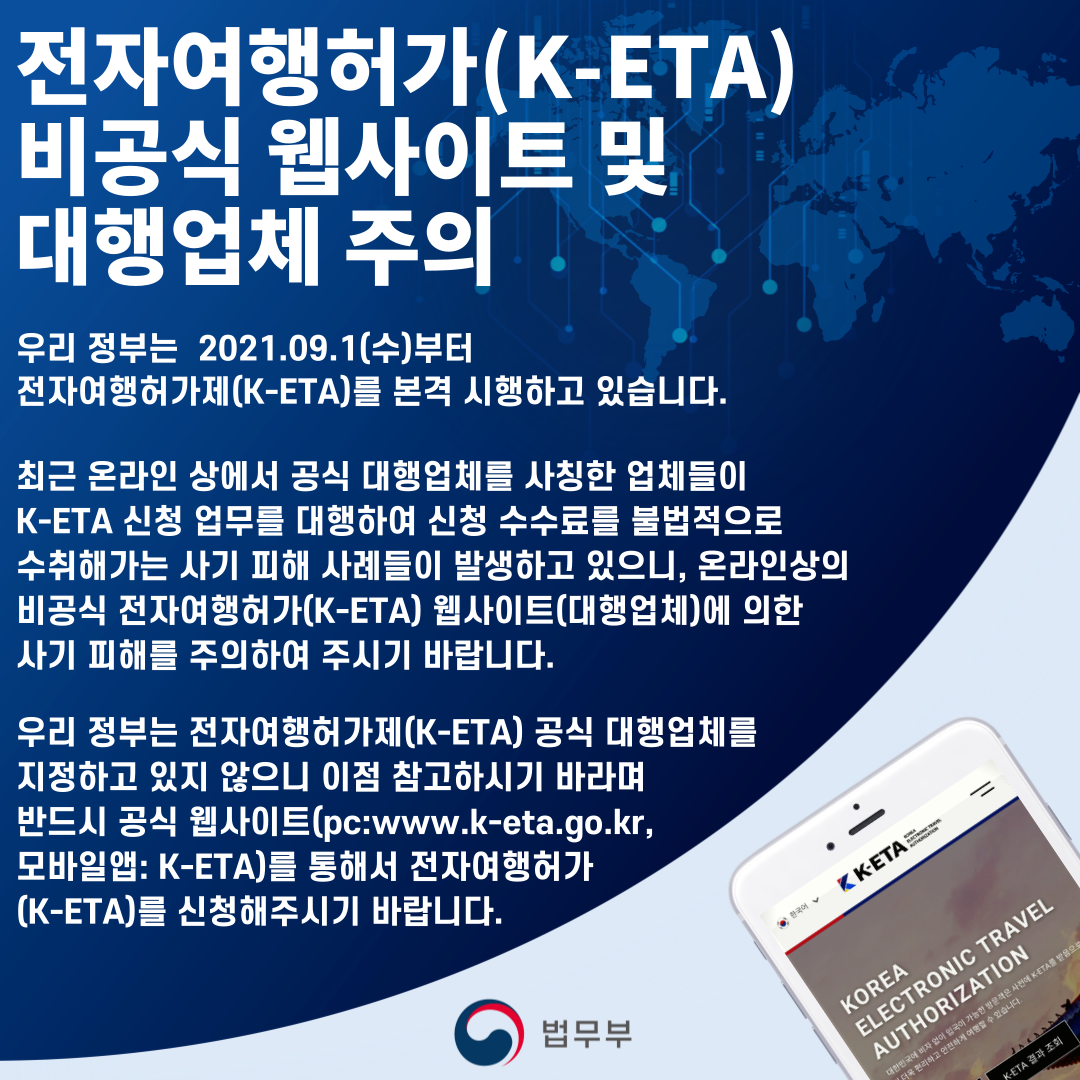 대한민국 법무부는 “우리 정부는 전자여행허가제 공식 대행업체를 지정하지 않는다”며 “반드시 공식 웹사이트를 통해 전자여행허가를 신청해주기 바란다”고 당부했다.