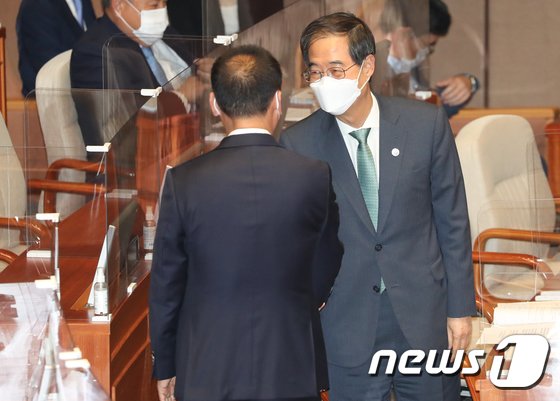 한덕수 국무총리가 25일 서울 여의도 국회에서 열린 정치·외교·통일·안보 분야 대정부질문에서 참석 의원들과 인사를 나누고 있다. 2022.7.25/뉴스1 © News1 허경 기자