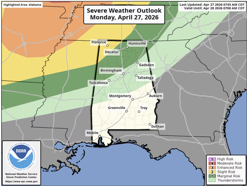 AL.com에 따르면 National Weather Service는 27일(현지시간) 북부와 중부를 중심으로 강한 뇌우 가능성이 이어질 것이라고 밝혔다.