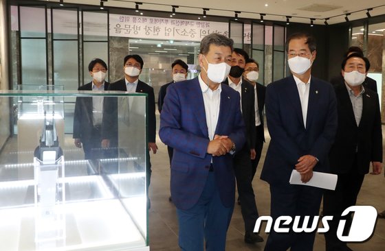 한덕수 국무총리가 3일 경기도 시흥시 (주)대모엔지니어링을 방문해 투자애로·규제개선 중소기업 현장간담회에 앞서 시찰을 하고 있다. 2022.6.3/뉴스1 © News1 김명섭 기자