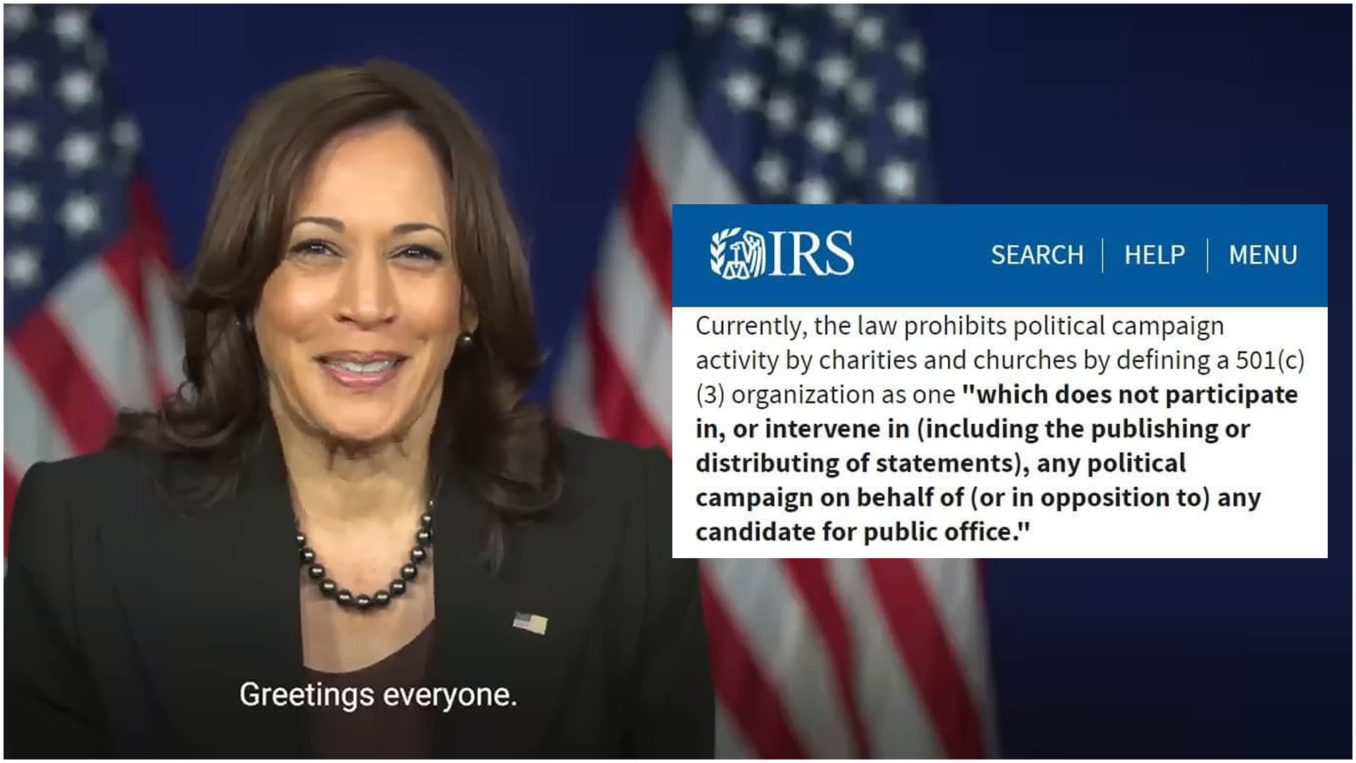 비영리단체 자격을 평가하는 국세청(IRS)의 홈페이지에는 “현재, 이 법은 501(c)(3) 잔체를 ‘공직 후보를 대표하거나 반대하는 어떤 정치운동에도(성명의 출판 혹은 배포를 포함해서) 참여하거나 개입하지 않는 것’으로 정의함으로써 자선단체와 교회의 정치운동 활동을 금지하고 있다”고 적시하고 있다.
