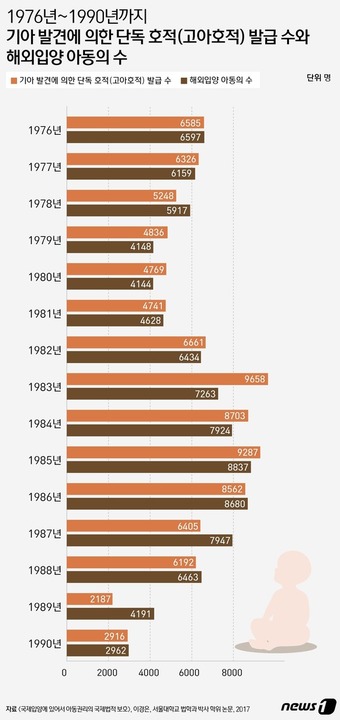 이 논문에 따르면 입양특례법이 시행된 2012년까지 해외 입양 아동 수와 고아 호적 발급 수는 거의 차이가 나지 않는다. 한 해 해외 입양이 가장 많았던 1985년(8837명)의 경우 기·미아로 분류돼 고아 호적이 발급된 수는 9287명이다.