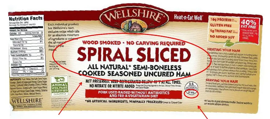 - Wellshire Wood-Smoked Spiral-Sliced Semi-Boneless All-Natural Cooked Uncured Ham, Seasoned. 12.5 lbs. 12/20/2021 sell-by date. Product code: 4033.
