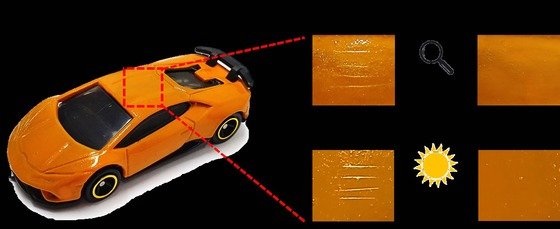 실제, 연구팀은 자동차 모형에 신소재를 코팅하고 표면에 흠집을 낸 후, 한낮 햇빛에 30분 정도 노출시키자 흠집이 완전히 사라지고 코팅 소재의 표면이 회복되는 것을 확인했다.