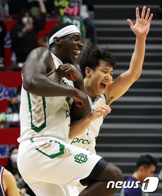 8일 오후 경기도 수원시 권선구 KT 소닉붐 아레나에서 열린 '2021-2022 KGC인삼공사 정관장 프로농구' 수원 KT와 원주 DB의 경기에서 조니 오브라이언트가 3점슛을 성공한 뒤 허웅선수와 기뻐하고 있다.2022.2.8/뉴스1 © News1 정진욱 기자