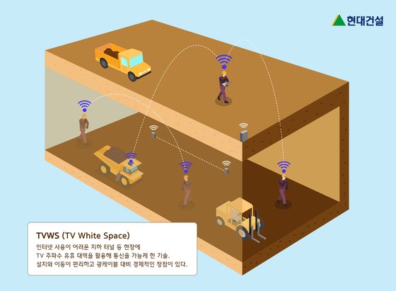 이 기술은 지하 공사에 TV 방송용으로 분배된 주파수 대역 중 비어있는 비면허로 누구나 사용 가능한 유휴대역(TVWS)을 활용한 무선통신기술이다. 현대건설은 별내선 복선 전철 공사현장에서 실증한 바 있다.