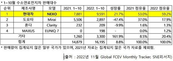 이밖에 혼다는 클래리티(Clarity) 생산이 2021년 8월 중단됨에 따라 지속적으로 부진한 상태다. 중국 맥서스(MAXUS)의 EUNIQ(유니크) 7 FCEV 모델은 올해 초 판매량이 부진했으나 점차 회복세다.