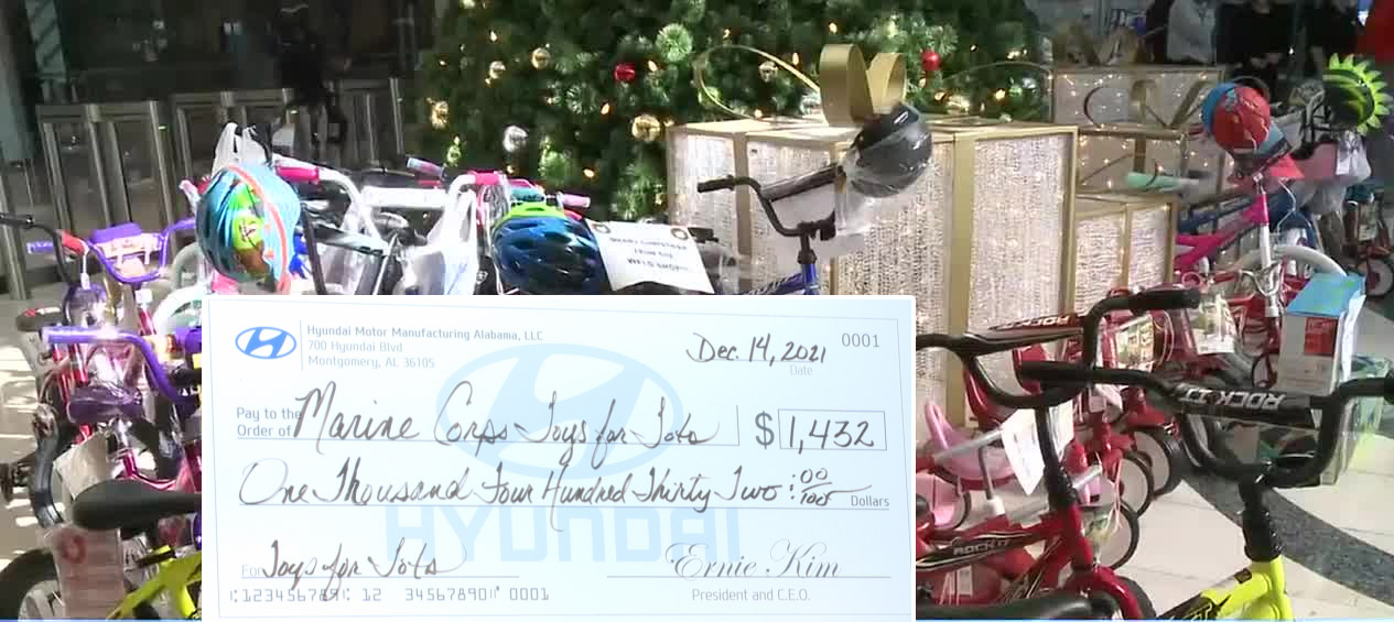 현대차는 몽고메리 주택청과 함께 해병대 ‘어린아이를 위한 장난감'(Toys for Tots) 캠페인에 11월과 12월 HMMA 직원들이 지역 소매상들로부터 구입한 127대의 자전거와 수십개의 다른 장난감들을 전달했다.