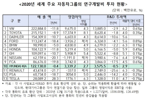 자동차산업협회는 현대차그룹 등 국내 기업들의 R&D투자가 상대적 미흡한 것은 매출액 대비 낮은 영업이익률로 인해 R&D투자여력이 부족한 것이 문제라고 지적했다.