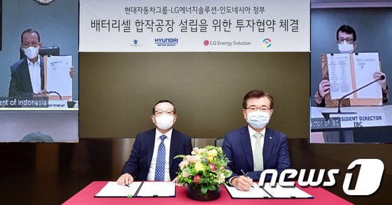 | 현대자동차그룹과 LG에너지솔루션이 인도네시아에 연산 10기가와트시(GWh) 규모의 배터리셀 합작공장 설립을 위해 인도네시아 정부와 투자협약을 체결하고 있다. 조성환 현대모비스 사장(앞줄 왼쪽)과 김종현 LG에너지솔루션 사장(앞줄 오른쪽), 바흐릴 라하달리아 인도네시아 투자부 장관(뒷줄 왼쪽 화면), 토토 누그로호 인도네시아 국영 배터리 코퍼레이션(IBC) CEO가 기념촬영을 하는 모습. (현대차그룹 제공) 2021.7.29/뉴스1 |
