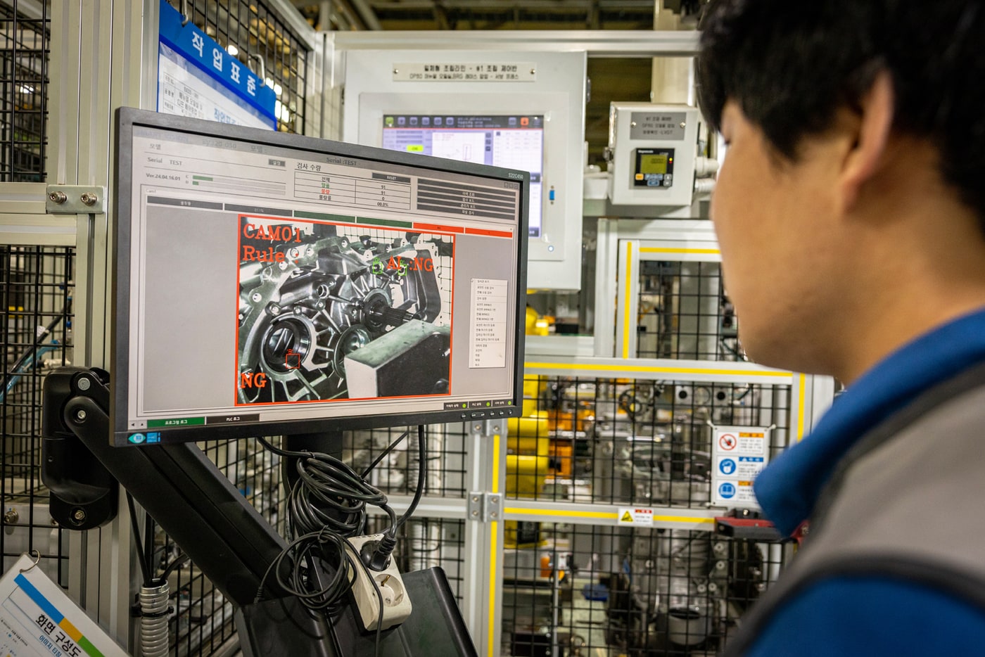 물류차량과 지게차 출입이 잦은 공간 4곳에 AI기반 감응형 폐쇄회로(CC)TV를 설치해 위험 상황이 발생하면 경보가 울린다. 현대트랜시스 전동화연구개발본부에서도 기어 내구성 검사를 딥러닝 AI 측정기계가 맡고 있다.