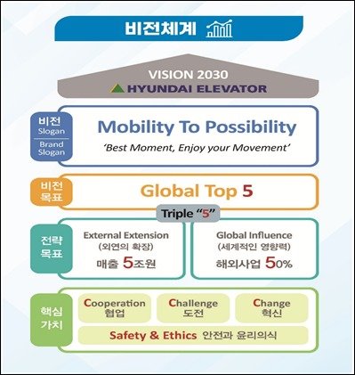 현대엘리베이터는 2030년까지 매출 5조원, 해외사업비중을 50%로 끌어올려 ‘글로벌 TOP5’를 달성하겠다는 목표를 세웠다.