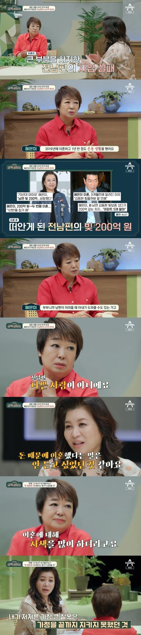 오은영 박사는 혜은이의 이혼 얘기를 조심스럽게 꺼냈다. 혜은이는 배우 김동현과 지난 2019년 이혼했다. 오은영 박사는 이를 언급하며 “(김동현이) 사업하다가 경제적으로 어려워져서 큰 빚을 떠안은 걸로 안다”라고 물었다.