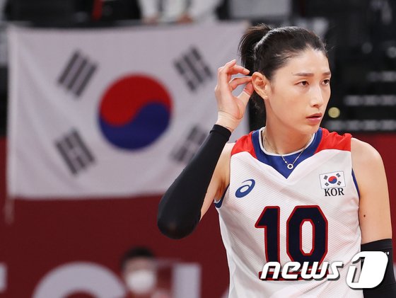 배구 김연경이 6일 오후 일본 도쿄 아리아케 아레나에서 열린 ‘2020 도쿄올림픽’ 여자 배구 준결승 대한민국과 브라질의 경기에서 점수 격차가 커지자 표정이 굳어지고 있다. 2021.8.6/뉴스1 © News1 송원영 기자
