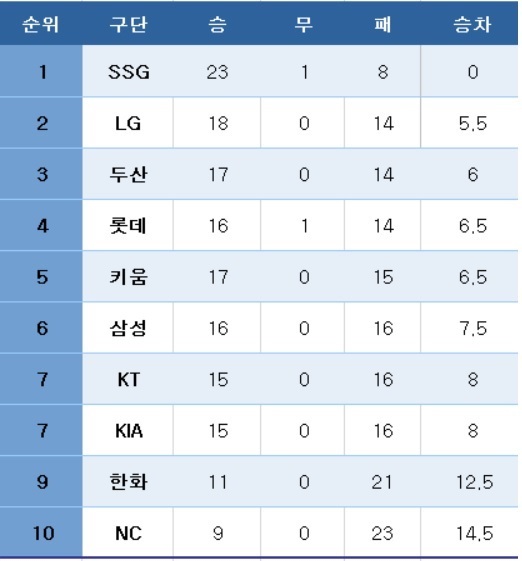 일주일 사이 KBO리그 순위표에는 여러 변화가 있었다. SSG가 선두를 질주하고 한화(9위)와 NC(10위)가 하위권에 머물러 있는 것은 동일하지만 중위권에서는 하루가 다르게 순위가 뒤바뀌는 치열한 접전이 펼쳐지고 있다.