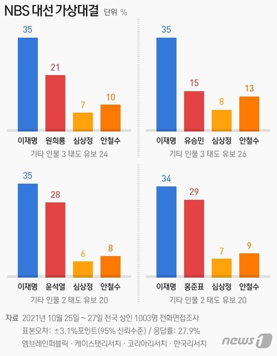 이 후보는 원 후보(21%), 유 후보(15%)가 포함된 4자 가상대결에서도 35%의 지지율로 모두 선두를 유지했다.