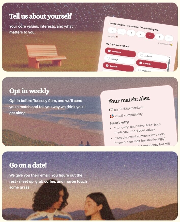 이 앱은 스탠퍼드대 대학원생 헨리 웡이 개발해 지난해 9월 출시됐다. 이용자는 가치관, 생활방식, 정치적 견해 등을 묻는 66개 질문에 답하면 알고리즘이 이를 분석해 가장 잘 맞는 상대를 매주 한 명씩 추천한다.