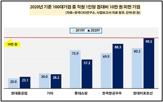 이외 롯데쇼핑(5만7200원), 한국항공우주(8만8300원), 현대미포조선(9만9500원) 세 곳도 작년 직원 1인당 평균 접대비가 10만원 미만으로 조사됐다.