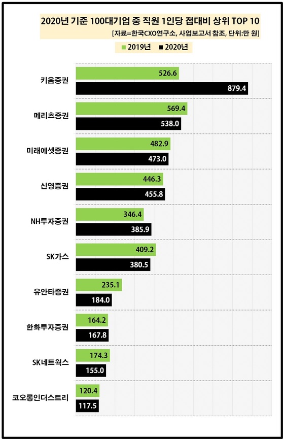 앞서 두 곳을 포함해 작년 1인당 접대비 상위 10곳 중 7곳은 증권사로, 미래에셋증권(473만원), 신영증권(455만원), NH투자증권(385만원), 유안타증권(184만원), 한화투자증권(167만원) 순이다. 비 증권사 중에서는 SK가스(380만원), SK네트웍스(155만원), 코오롱인더스트리(117만원) 순으로 1인당 접대비 지출 상위에 속했다.