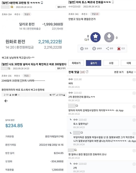 28일 오후 2시 20분을 전후로 디시인사이드 주식갤러리와 직장인 커뮤니티 블라인드 등에는 “토스 앱 버그로 돈을 벌었다”는 인증글이 쏟아지기 시작했다.