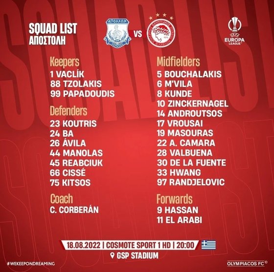 올림피아코스 구단은 17일(한국시간) 2022-23시즌 유럽축구연맹(UEFA) 유로파리그에 출전할 24인의 엔트리를 발표했다. 등 번호 33번을 받은 황인범은 미드필더 12명에 이름을 올렸다.
