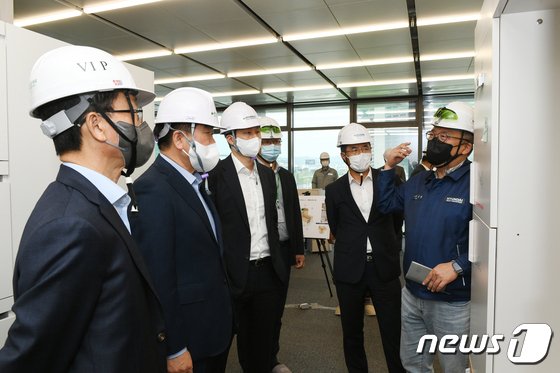 권오갑 회장(왼쪽 두 번째), 정기선 사장(왼쪽 세 번째) 등이 경기도 판교에 건설 중인 GRC 현장을 방문, 둘러보고 있다. © 뉴스1