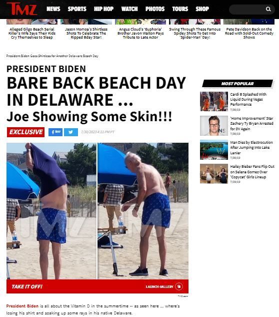 겔러 외에도 미국 연예매체 TMZ도 같은 시각 해변을 찾아 바이든 대통령의 사진을 찍어 “바이든 대통령 피부를 드러내다!(Joe Showing Some Skin!)”고 보도했다.