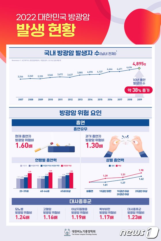 학회에 따르면 국내 신규 방광암 환자 수는 2010년 3545명에서 2019년 4895명으로 9년만에 약 38% 증가했다.