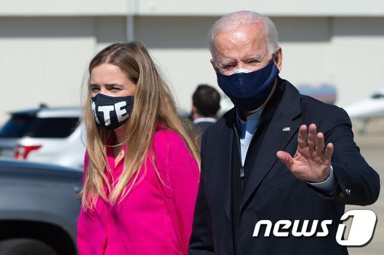 조 바이든 미국 민주당 대선후보가 18일(현지시간) 노스캐롤라이나주 더럼에 있는 롤리 더럼 국제공항에 손녀 피네간과 도착을 하고 있다. © AFP=뉴스1 © News1 우동명 기자