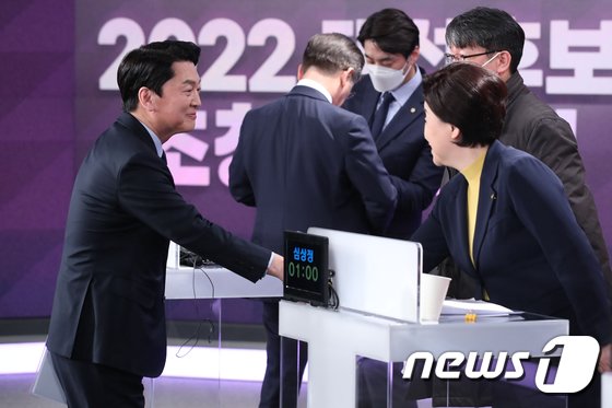 안철수 국민의당 대선 후보와 심상정 정의당 대선 후보가 11일 오후 서울 중구 필동 매경미디어센터에서 열린 한국기자협회 주최‧방송 6개사 공동 주관 2022 대선후보 초청 토론회 시작에 앞서 인사를 나누고 있다. 2022.2.11/뉴스1 © News1 국회사진취재단