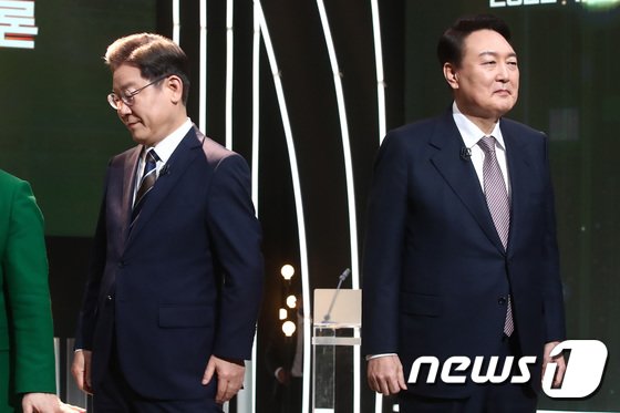 지난 3일 오후 서울 여의도 KBS 공개홀에서 열린 2022 대선후보 토론에서 이재명 더불어민주당 대선 후보가 기념촬영을 마친 뒤 자리로 돌아가고 있다. 오른쪽은 윤석열 국민의힘 대선 후보. 2022.2.3/뉴스1 © News1 국회사진취재단