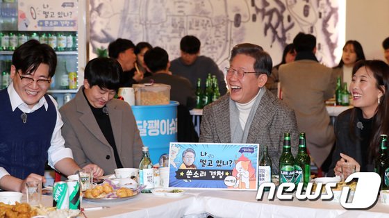 이재명 더불어민주당 대선 후보가 3일 오후 전북 전주 객리단길의 ‘가맥집’(슈퍼마켓 형식의 맥주집)에서 2030 청년들과 만나 ‘쓴소리 경청’ 시간을 갖고 있다. 2021.12.3/뉴스1 © News1 구윤성 기자