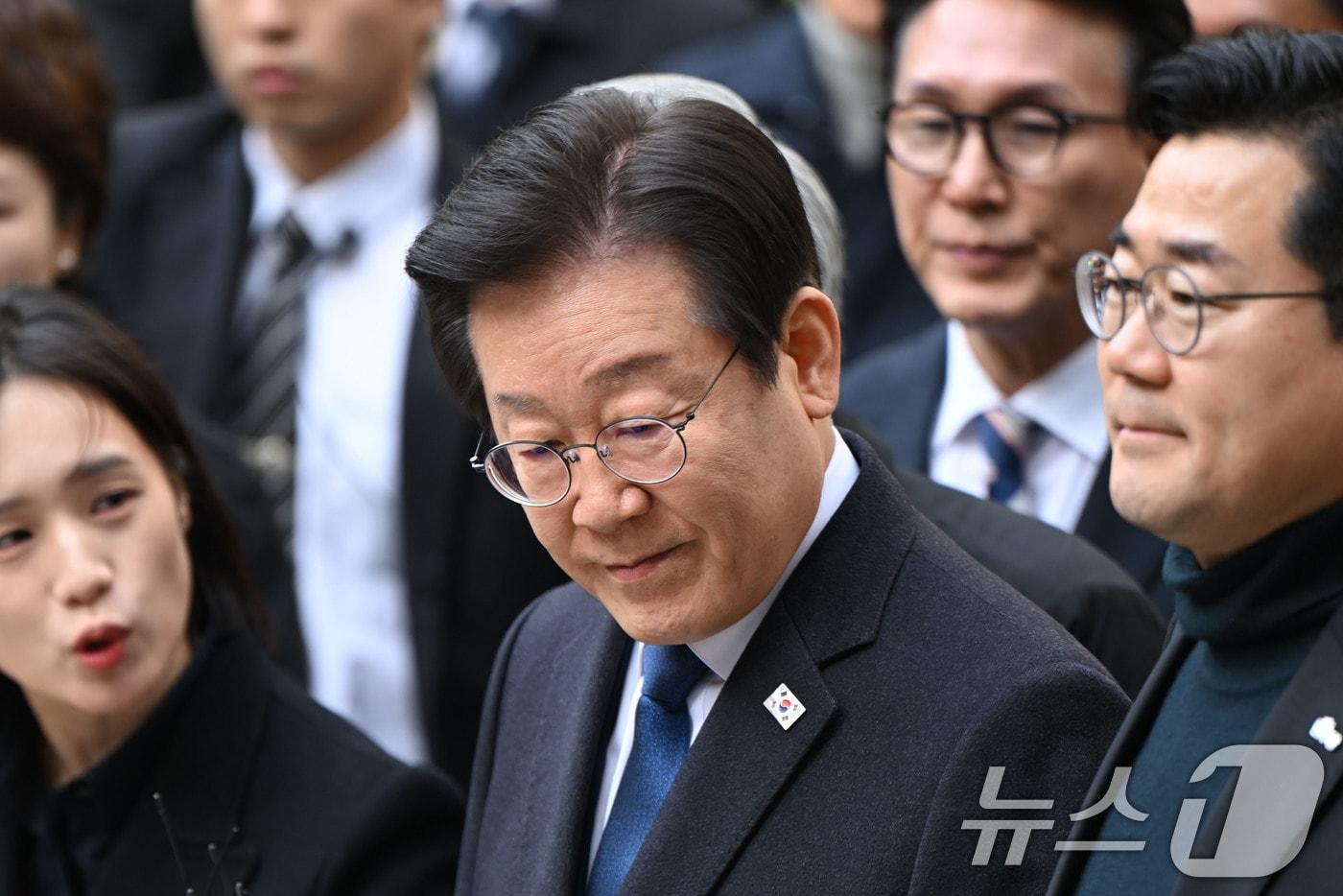 이재명 더불어민주당 대표가 25일 서울 서초구 중앙지방법원에서 열린 위증교사 혐의 1심에서 무죄를 선고 받은 후 법원을 나서고 있다. 서울중앙지법 형사합의33부(부장판사 김동현)는 "피고인에 대한 공소사실은 범죄사실의 증명이 없고, 위증교사의 고의가 있었다고 보기 어렵다" 며 위증교사 혐의로 기소된 이 대표에게 무죄를 선고했다. 2024.11.25/뉴스1 ⓒ News1 사진공동취재단