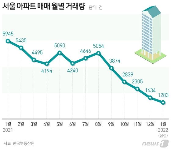 17일 한국부동산원에 따르면 서울 아파트 매매 거래량은 지난 1월 1283건으로 잠정 집계됐다. 지난해 1월 거래량 5945건에 비해 78.4% 가량 급감한 수치다.