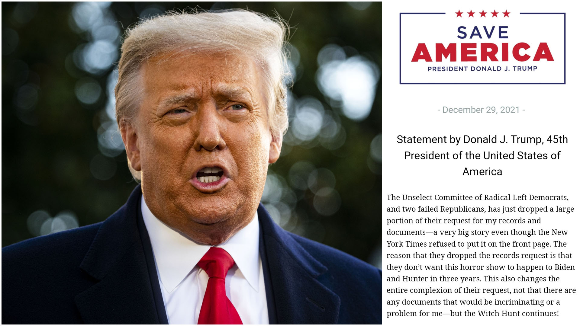 도널드 트럼프 45대 대통령은 오늘 오후 성명을 내고 “급진좌파민주당 안특별위원회와 실패한 공화당 의원 두 명이 방금 내 기록과 서류에 대한 요청의 상당 부분을 취하했다”면서 “뉴욕타임즈가 1면에 싣는 것을 거부했음에도 불구하고 매우 큰 기사거리다”라고 밝혔다.
