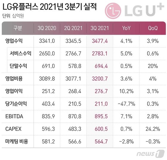 이날 LG유플러스는 2021년 3분기 연결기준 매출 3조4774억원, 영업이익 2767억원을 기록했다고 공시했다. 매출과 영업이익 모두 전년동기 대비 각각 4.1%, 10.2% 늘었다.