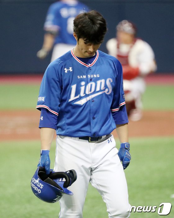 3일 오후 서울 고척스카이돔에서 열린 ‘2021 신한은행 SOL KBO 리그’ 키움히어로즈와 삼성라이온즈의 개막 경기에서 6회초 무사 1루 이학주의 좌측 외야 펜스를 맞고 이용규가 잡은 안타 때 플라이아웃으로 판단한 이학주가 아웃 판정을 받자 아쉬워하고 있다. 2021.4.3/뉴스1 © News1 김진환 기자