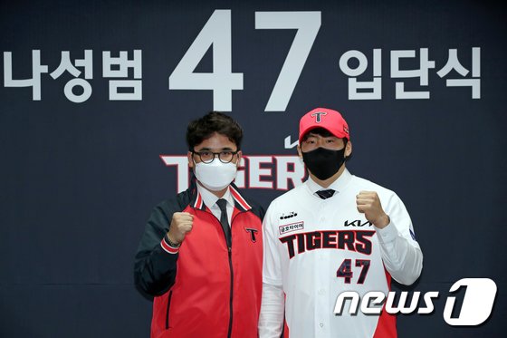 말쑥한 정장 차림으로 입단식에 참석한 나성범은 장 단장으로부터 등번호 47번이 새겨진 유니폼을 건네받아 착용했다. 이어 김 감독과 장현식, 황대인이 나성범에게 꽃다발을 주면서 축하 인사를 건넸다.